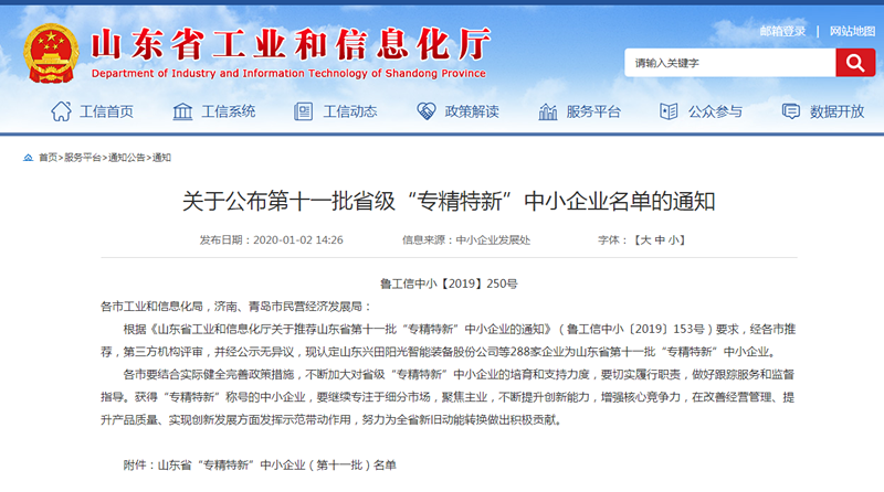 根據(jù)《山東省工業(yè)和信息化廳關于推薦山東省第十一批“專精特新”中小企業(yè)的通知》(魯工信中小〔2019〕153號)要求,經(jīng)各市推薦,第三方機構評審,并經(jīng)公示無異議,認定我公司山東興田陽光智能裝備股份公司為山東省第十一批“專精特新”中小企業(yè)。