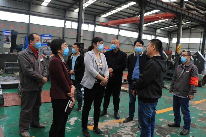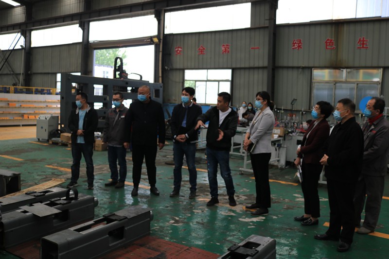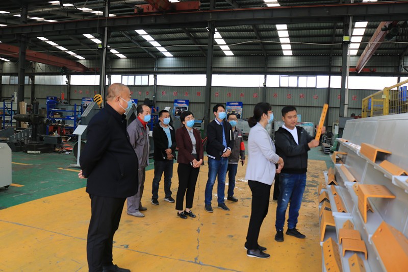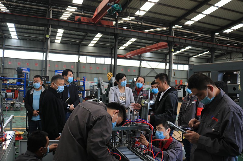 逯明書記一行首先來到了生產(chǎn)車間,現(xiàn)場考察企業(yè)在常態(tài)化疫情防控下的復(fù)工復(fù)產(chǎn)情況和面臨的困難。在裝配調(diào)試區(qū),逯書記詳細了解了一拖二全自動口罩機、高速數(shù)控角鋼鉆孔生產(chǎn)線、新型高速數(shù)控角鋼沖孔打字剪切生產(chǎn)線等設(shè)備的裝配調(diào)試情況和生產(chǎn)過程中遇到的困難。